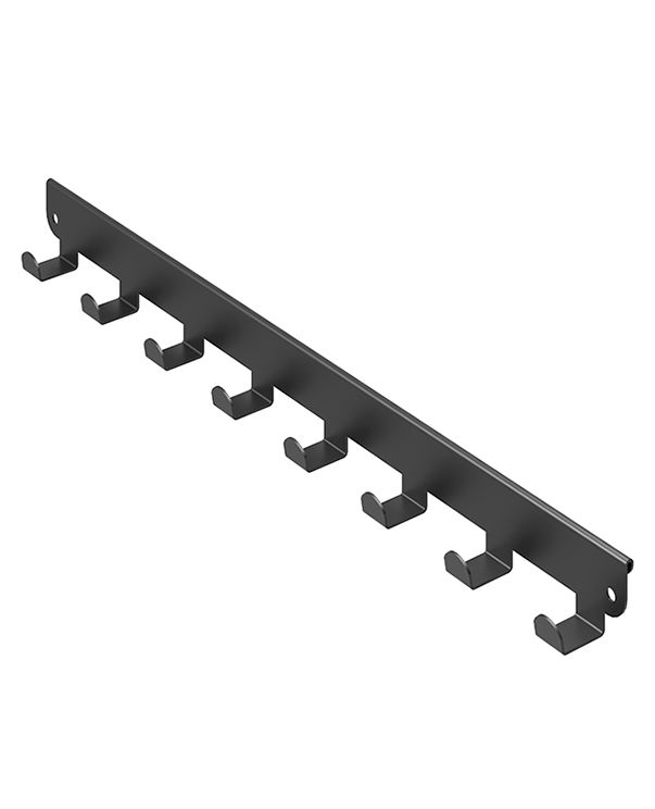 Крючки представляют собой металлическую планку с 8 крючками, которая навешивается на внешнюю боковую поверхность кронштейна в гардеробной системе ПРАКТИК HOME.