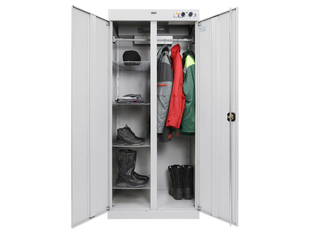 - Вместительность. Глубина шкафа 600 мм позволяет сушить объёмные вещи, в том числе спецовки и зимние куртки.