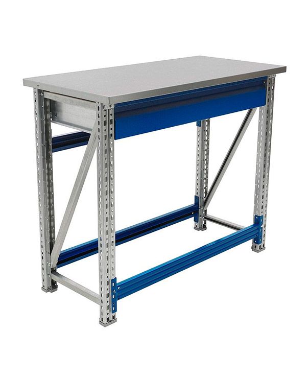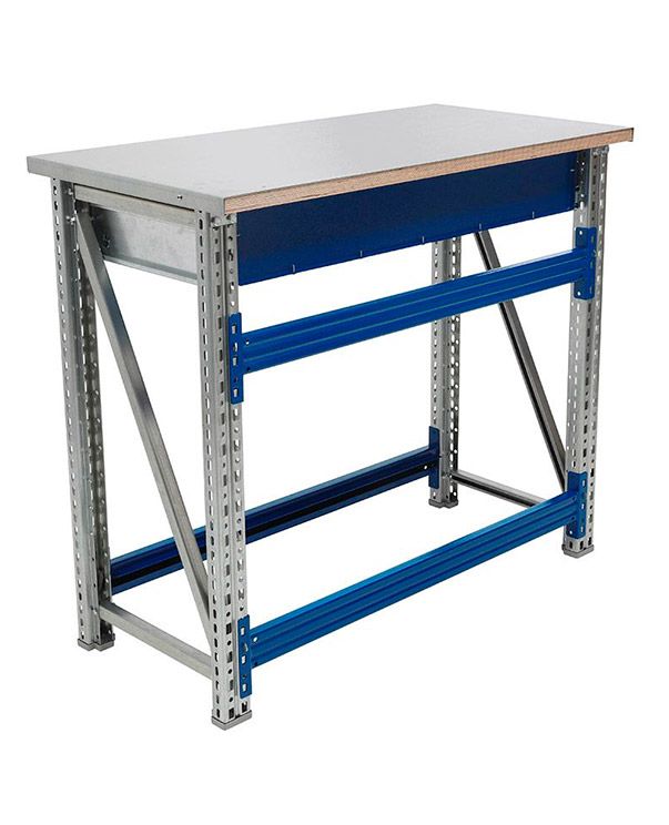 - Основные элементы верстака (опоры, полка, накладка на столешницу) изготовлены из оцинкованной стали, что позволяет устанавливать его в местах с повышенной влажностью.