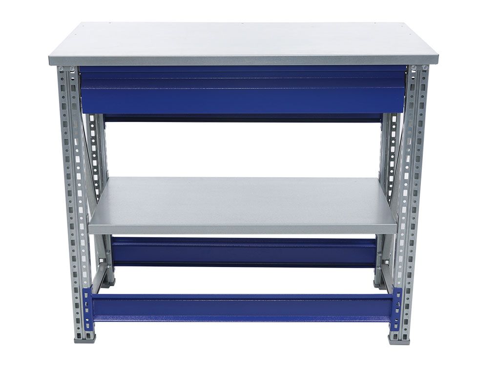- Возможность дополнить верстак полкой (нагрузка 100 кг) и выдвижным ящиком (нагрузка 30 кг).