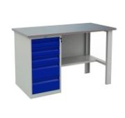 - Верстак окрашен порошковой краской, цвет покрытия корпуса серый шагрень (RAL 7038), лицевая панель дверцы тумбы – синий шагрень (RAL 5002)